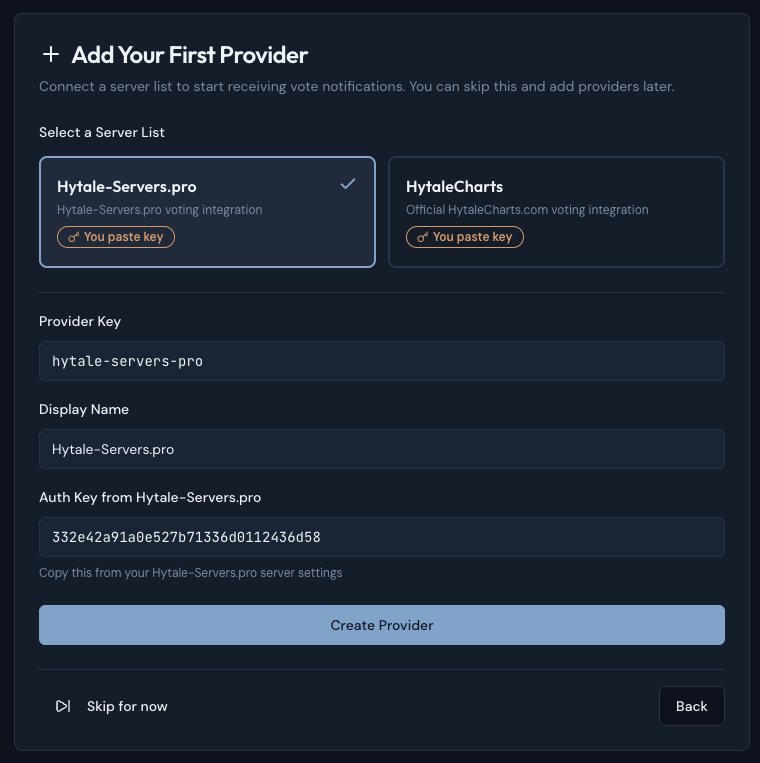 Provider KeyandDisplay Nameas is. Remember theSecret Hashfield we copied earlier? Past that in theAuth Key from Hytale-Servers.profield inside Votepipe. Then press the "Create Provider" button.