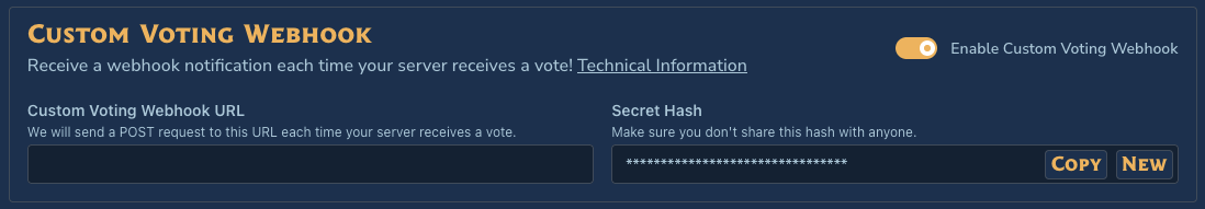 - Click "Copy" on the Secret Hash field. This will be used to tell votepipe that the votes come from Hytale-Servers.pro.
