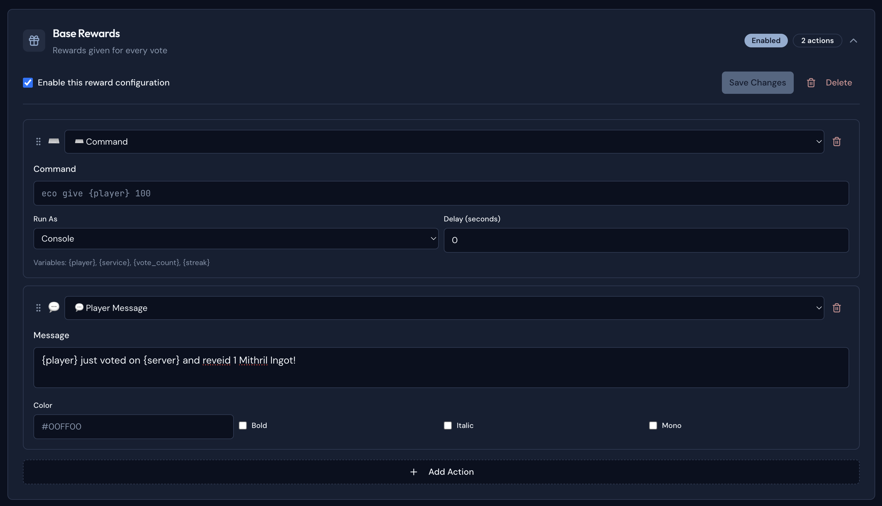 {player} just voted on {server} and reveid 1 Mithril Ingot!. This will let other players know that someone voted and what they got. Incentivizing them to also vote. - Press the