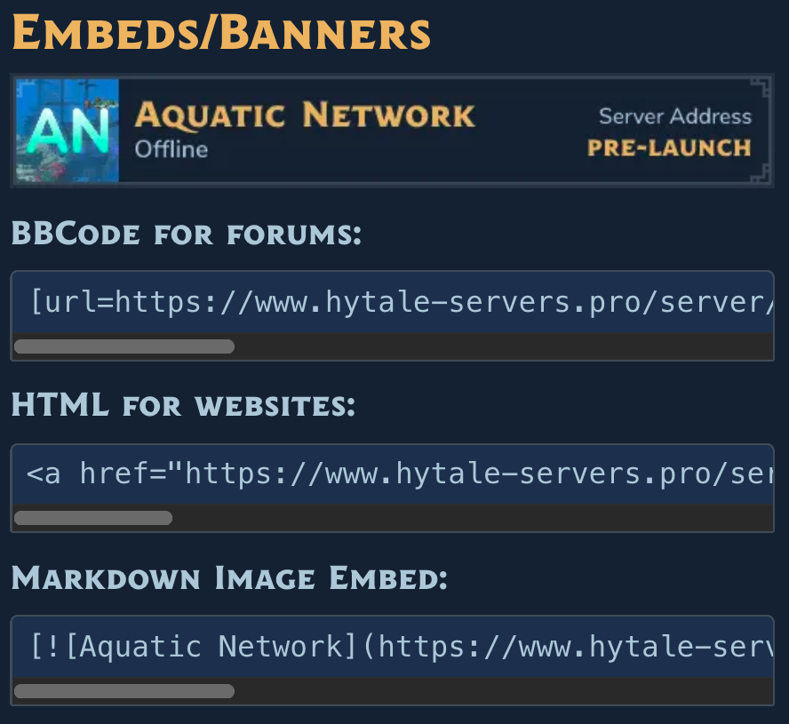 Banner Embeds are powerful, embeddable images that display live server information and can be easily added to virtually any external website, forum signature, blog post, or community platform. They provide a quick, visual snapshot of a server's status, allowing anyone to proudly showcase their favorite Hytale server wherever they engage online.
